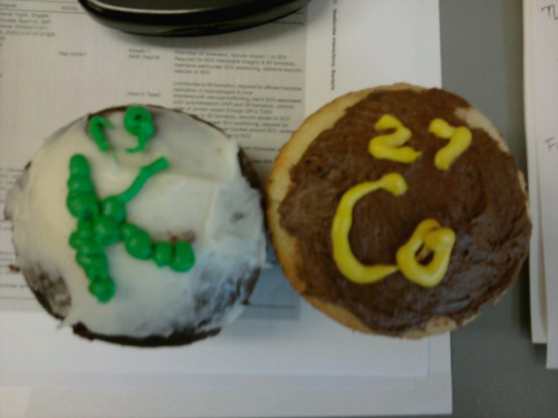Today is the day before mole day (for you non chemists out there, a mole is 6.22 x 1023 of anything. So a mole of eggs would be 6.22 x 1023 eggs. Wow… That is a lot of eggs…). Anyway, in celebration of mole day, the chemistry department made elemental cupcakes that you could buy for a penny a proton. I bought Potassium (of course) and then Cobalt for my boyfriend because he asked for it. And I think that is all! Have a happy weekend! The Denver zombie crawl is this weekend so watch out… next week’s photos are going to be veeeeeeeeeeeeeeery interesting…