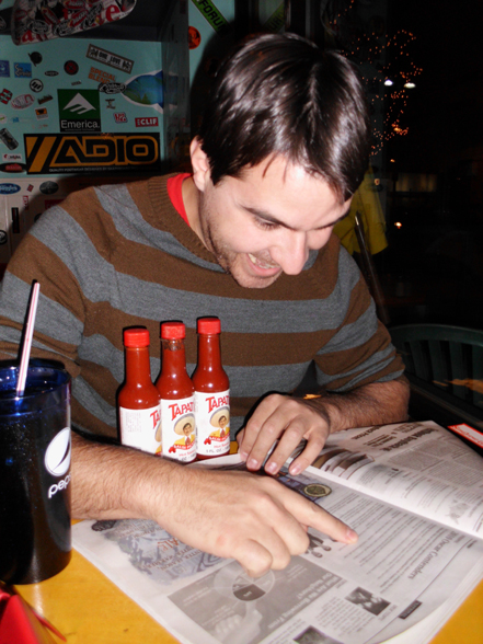 As for the picture, Cobalt and I were eating at Wahoo’s Fish Tacos one day and he was reading The Onion while we waited for our food. We sat next to a windowsill that had a bunch of bottles of Tapatio hot sauces sitting on it. I thought it’d be cute if Cobalt read The Onion to them as if they were his children because… well… he really loves hot sauces. You can read his blog to find out more…