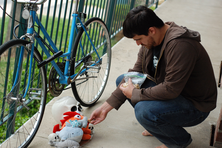 For today’s picture, I bring you this gem that Cobalt and I took this last weekend. We have been excited about working on our photography techniques and composition by emulating other photographs/film screen shots that inspire us. Today’s picture comes from heyitsclay13’s “A Pigeon of a Moment” photo on DeviantArt.com. Cobalt found this awesome picture and I thought it would be fun for us to recreate it using our favorite “creatures,” sharks and skulls… and one strange bright orange fish monster. It was a lot to fun to have the picture in my head and try to get the composition juuuuuuuuuust right. That’s pretty much the story here. Btw, you should definitely tell heyitsclay13 that his picture is awesome because, well, it is.