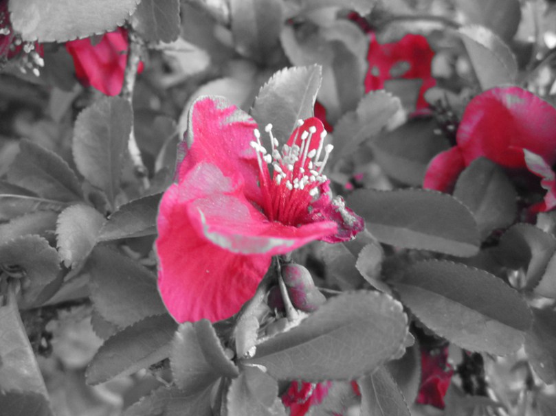 Yay! More fun with Color Accent mode on the SD1400IS camera! Today’s picture is done with color accent and macro mode. Whoa. This one isn’t as nicely put together as the sharks from Tuesday I think. Parts of the flower that were in the sun were apparently not red enough to show up as red here. Oh well… still looks kind of neat. Looks like the flower got a little dust on its petals…