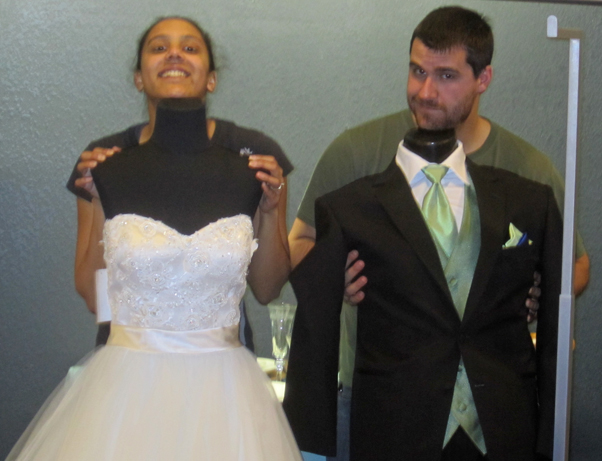 Regardless, it was a good trip – though the jury is still out on the wedding rings discussed last week. Today’s picture is of Cobalt and me being bored in the bridal shop while waiting for our consultant to draw up an estimate on the tuxes. Here’s another picture of me wearing Cobalt’s tie: