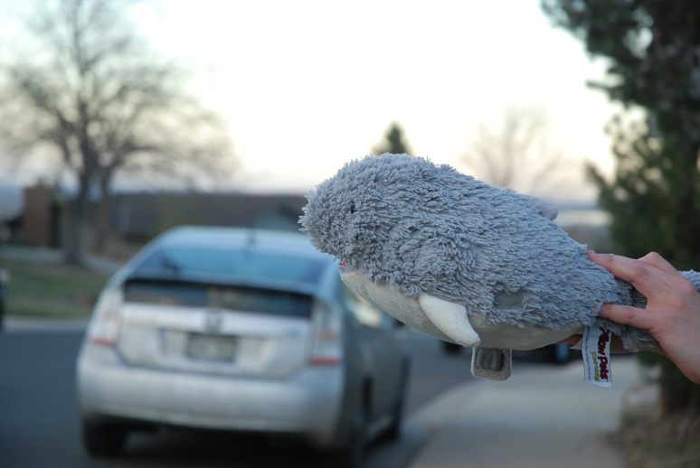 Anyway, some of the craziness ended on Friday when we had a huge lab cleanup to prepare for the big lab move next month. It was ridiculously epic. I was sooooo busy taking care of all the old expired chemicals we found in the weirdest places (thanks to the student I inherited my workspace from… NOT happy with him right now). After all of that, A and I took our giant stuffed sharks on a walk. While we were out playing with my camera and the sharks, one lady walked past us and asked us if we were taking our whales for a walk. A and I just looked at each other for a second and nodded as we passed. Then we burst out laughing… they’re sharks, not whales! Geez! Anyway, we (and the sharks) had so much fun this past weekend so I thought I would share some pictures – up there they are both sitting in a pine tree (obviously). Down there, there’s Fernando trying to eat an out of focus Prius and Gustav and me doing a silly dance…