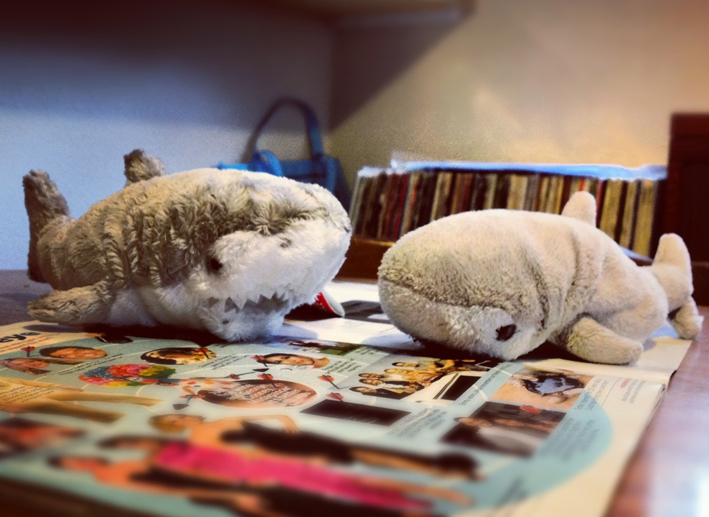 Because Scrarmpl (scr-ARM-pul) was my first stuffed shark, I decided to buy the same stuffed shark to throw at my wedding (the gateway shark… hahaha). He arrived Monday and I am a bit embarrassed to see how “loved” Scrarmpl is compared to his little brother. They barely even look like the same shark! In this picture, Scrarmpl and “new shark” are reading the most recent Entertainment Weekly together… As you can see, “new shark” is much bigger and fluffier than Scrarmpl…
