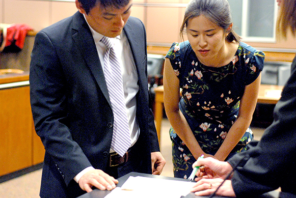 Geez stop reminiscing Potassium and get on with the pictures story already. So Friday was a beautiful day for a wedding! It was so warm outside that Cobalt and I didn’t have to put on jackets as we drove across town to the Boulder County Justice Center. There we met up with some of our other friends and L and her soon-to-be-husband J. We had some photo time in the courtroom before the judge came in so I hobbled around on my poor little ankles and got pictures of everyone pre ceremony. The ceremony was short but sweet and then we all got to sign the marriage license as witnesses! Talk about a special marriage license – clearly their marriage is highly approved of because it has not one, not two, but seven witness signatures. When Cobalt and I got married in California, there were some ridiculous rules about marriage license signatures (all of the signature must fit IN THE LINES OF THE BOX OR YOUR MARRIAGE LICENSE IS NOT VALID!). Yikes! So this was much better. :) After the ceremony and license signing we all braved the crazy rush hour traffic to go out for Korean BBQ. It was delicious and a really fun evening! Cobalt and I left full of food and really happy to have spent such a good evening with friends. Thanks L and J for letting us be a part of your special day. :D