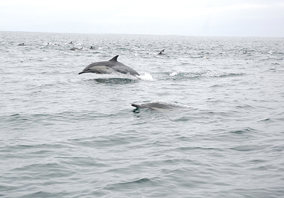 Once when we found the whales, they were surrounded by hundreds of long-beaked common dolphins. Seriously, the ocean was suddenly churning with dolphins everywhere. They swam toward us and played around the boat. So fun and such a new version of photography.