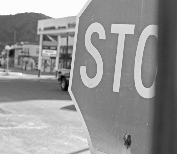 Cobalt and I have been doing more traveling (I know… it never stops…) and on our way back this time, we stopped and walked around the small town of San Luis, CO just to spend some time out of the car. Anyway, on this stop, this stop sign here was creaking away because as you can see, it is barely connected to its pole anymore. It’s hanging by a thread. I thought it was perfect for a black and white picture…