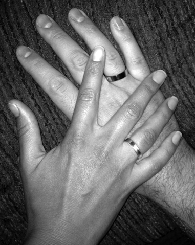 I had more of a challenge. Because this ring is so much thicker than my engagement ring, the largest size I picked out (which would have been too big for a skinny ring like my engagement ring) was actually a little small. It went on my finger just fine but then it didn’t want to come off. In fact, I actually hurt my left finger trying to get the sizer off, which is why we are wearing our sizers on our right hands in the picture. So last weekend, we got to go on a fun trip to one of our local jewelers so that I could ask about sizing. Turns out that the half size up fits much better, going on easily but coming off with just a little encouragement instead of yanking and pain. So yay! We shipped the sizers back on Monday along with our preferred sizes so crisis over. Whew.