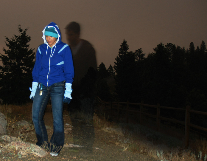 Working with Cobalt on picture editing is both fun and challenging. Because both of us have worked alone for so long, our creative muses often end up bickering. Here you are seeing a pretty good compromise though. We first started by cropping the picture (Cobalt liked having those extra trees to the right of the pair of us because it gave the picture more of a cinematic tone and I just wanted it to be of the two of us… but then I looked at it his way and decided it looked more dramatic). Then came the little things: getting the dusk specks off (this was a fairly long exposure), getting rid of unwanted things in the background (stop signs, windows, fences, etc), and playing a little with the lighting on my face. I think that’s pretty much it though.
