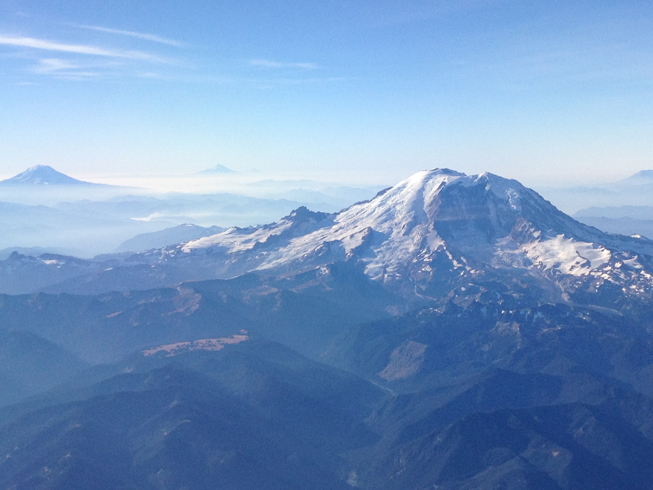 Picture at the top – Mt. Rainier, which is the 14’er that looms over Seattle, and the mountains to the south of it. I took that picture from the plane.