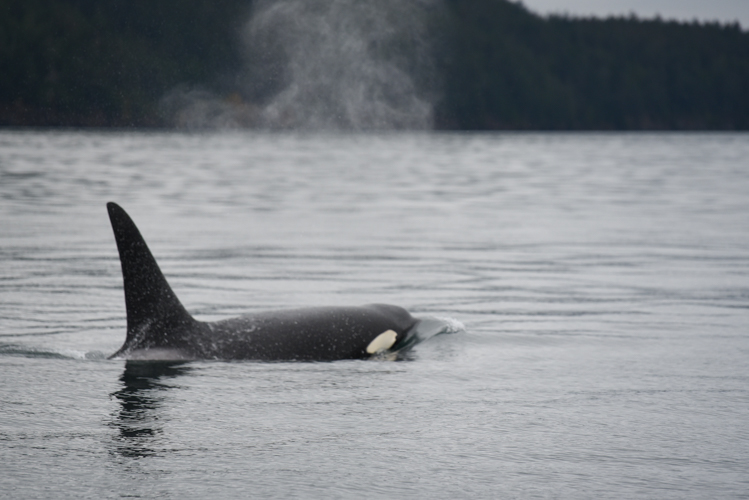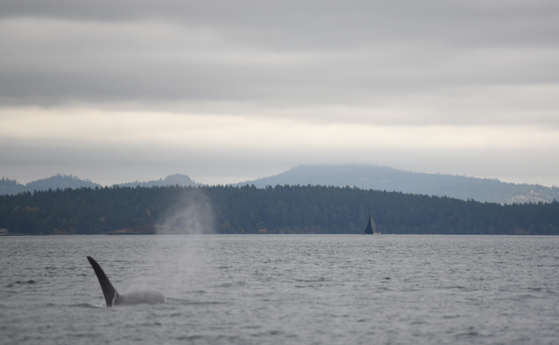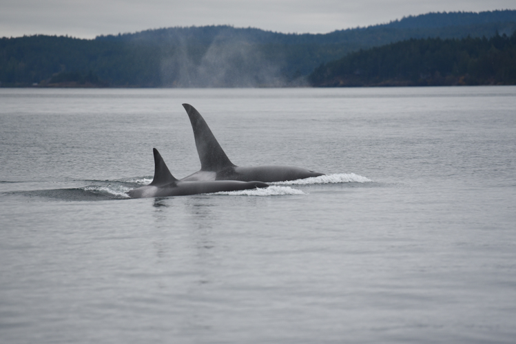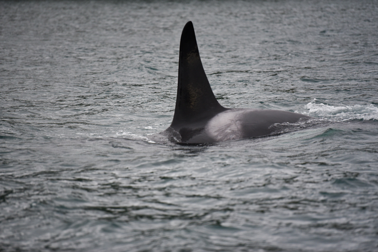 Time for a short killer whale lesson: there are two types of killer whales in this area: residents and transients (or Bigg’s). Residents were named because they were thought to reside only in this one area while the transients were thought to roam up and down the coast. But it turns out that both kinds can be found anywhere between Alaska and Monterey Bay, California, according to our guides. So the names “transient” and “resident” are kind of misleading. Annnnnnnyway – resident killer whales eat Chinook salmon but Bigg’s killer whales, like T101 and her family, eat everything. Especially seals. Which is what they were hunting when we found them.