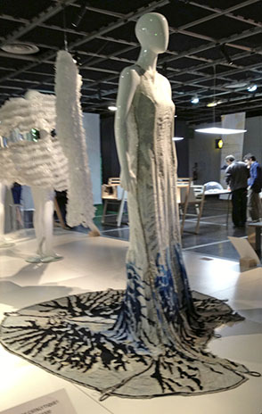 Then there was this really neat exhibit about new textiles that people have developed. There was a bioluminescent jacket that glows at night so people will be able to see you, a dress that cleans the air as you wear it, a blanket that glows blue for babies with jaundice so that they can be swaddled and cuddled while they are healing, and more! I thought this exhibit was cool because it kind of combined creativity with science – showing people how science can be creative (Note: I think all scientists need to be creative, not just the ones who develop new textiles, but I thought this was a good example).