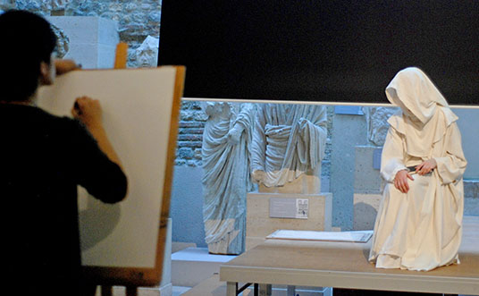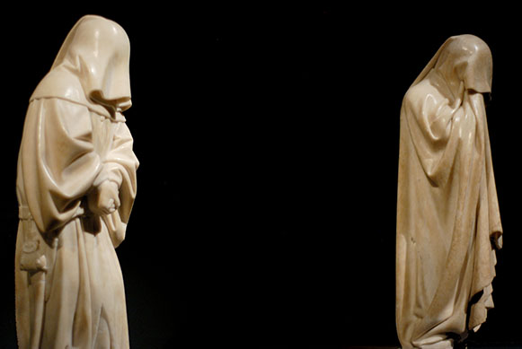 The museum was really cool – such neat old art in such an impressive building. The architecture was awesome! C and I had fun trying to read the descriptions of the art since they were mostly in French and I had fun trying to photograph cool works of art without using my flash. Anyway, I learned that every museum in Paris has some sort of traveling exhibition on display in addition to their normal set of art. In general, I found that I liked the exhibitions more than the rest of the art… :-/ The exhibition on display that night was “Larmes d’Albâtre” or “Alabaster tears.” I really liked it. First of all because I liked the statues (and how they were displayed) and second of all because I thought the hooded ones looked like dementors. :D C liked that too. Anyway, things got even better as we got further into the museum because they had people dressed up as the statues and other people sketching them! How cool!