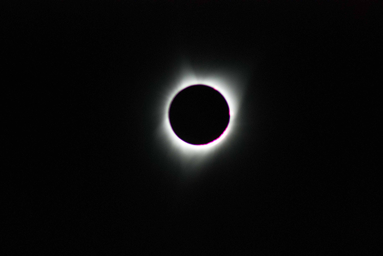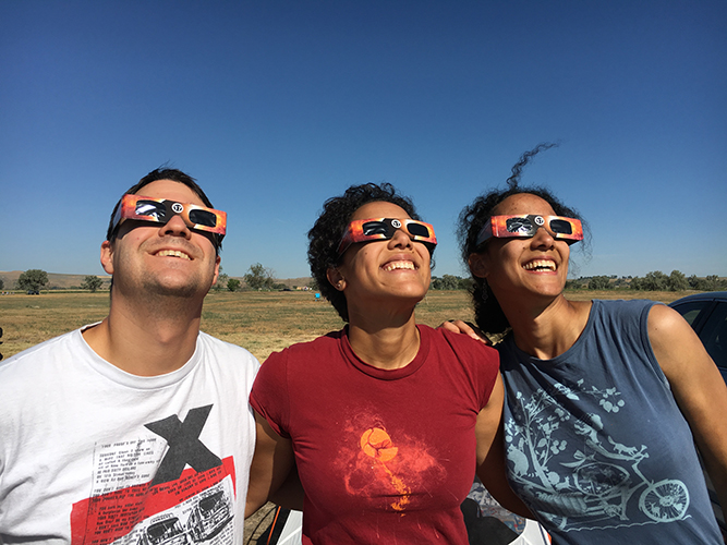 So as we got closer to the ring phase, I turned on the GoPro and the Zoom recorder so they could happily record the event while we forgot they were recording us. Then I set up my camera on the tripod and aimed it sort of in the direction of the sun (can’t look through the lens at the non fully eclipsed sun). And then as soon as we hit the ring, I sprang into action: pointed camera at sun, focused lens (definitely no autofocus on this lens), snapped photo, and hoped that the exposure time was right. It looked awesome! I snapped a few more with different exposure settings even though I wasn’t supposed to and then I stopped and watched the rest of totality with Cobalt and my sister. We may have taken some selfies…