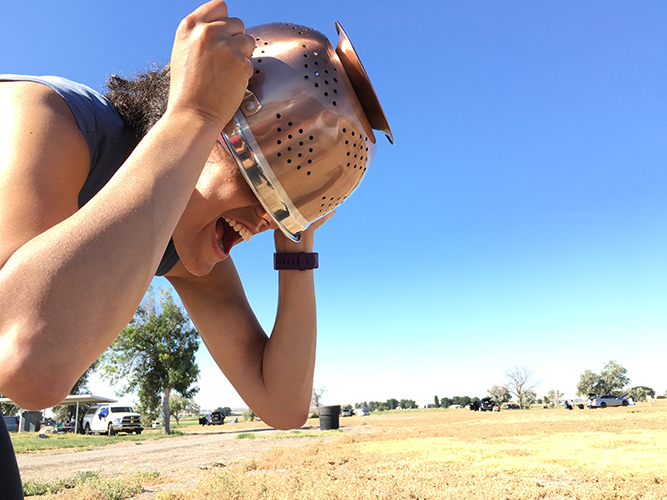 In the morning, we had coffee and oatmeal and then set about preparing the campsite for the eclipse. Cobalt and I had bought a pack of eclipse glasses from an American-Astronomical-Society-approved site a while ago so those came out. We also brought a colander for playing with the eclipse light and a variety of recording devices: my Zoom audio recorder for recording us reacting to the eclipse, our GoPro for a video of the same thing, and my DSLR + an old 70-200 mm lens (+ 2x multiplier) that I acquired from my grandpa. Pretty sure it was not built for a digital camera. I am so happy that I got everything to play nicely with my camera.
