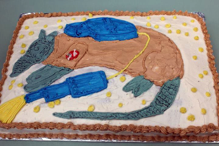 About a half an hour later the three of us had designed that super amazing cake up there: a shark bringing a skeleton bride and groom to the beach. We loved it and she loved it. She was already planning on how to make the beach look beachy – with seashells and seaweed. Also everything on this cake (minus the cake topper of course) is completely edible – from the sand to the shark’s teeth… Makes me happy to look at it. Also, it was delicious. The shark was chocolate (his fins are graham crackers) and the beach was lemon with raspberry filling (with real raspberries!!!). Plus she made us another shark cake to save for our anniversary (and it survived the trip back to CO!). Yum.