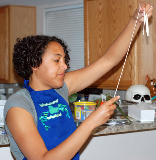 Then yesterday we made salmon teriyaki with homemade udon noodles! The recipe called for stretching the noodles out after we cut them and before we boiled them. Cobalt and I had a lot of fun with that part, as you can see from the above and below pictures.