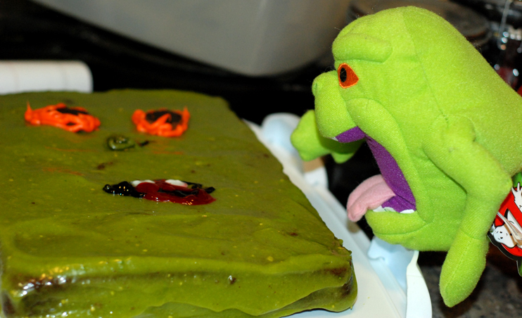 Anyway, upon frosting our cake yesterday afternoon, Cobalt and I decided that it reminded us of Slimer from Cobalt’s favorite movie ever, Ghostbusters. Thus, Cobalt decorated our cake in proper Slimer fashion! Shown above – our claw machine Slimer gazes in awe at himself in cake-form. Below – slimer cake eaten… Yummmm…