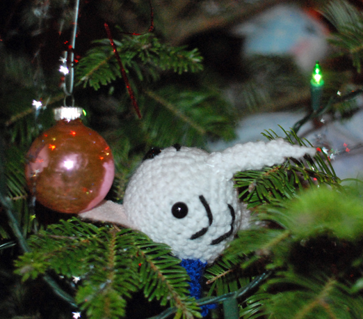 Picture: One of the many crochet sharks I made, “Licky shark,” licking an ornament on my family’s Christmas tree last year. I took this picture when I was playing with the out of focus light so you can see that the reflection on Licky shark’s eye (and all the other out of focus light) is in the shape of a star. I like it…