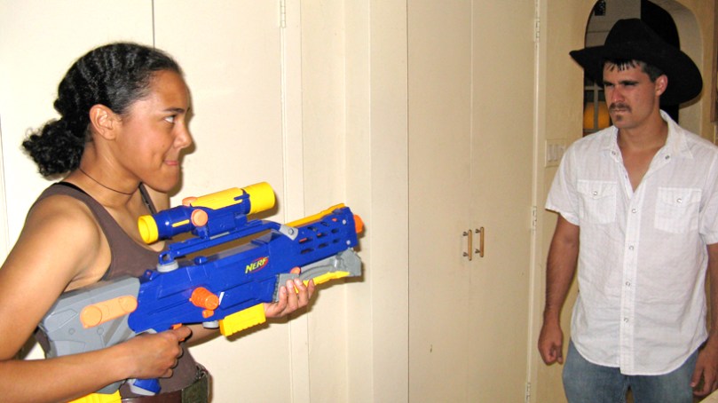 Photo: This picture is from the “not dating” phase of our relationship. We were at a birthday party (actually for our friend who is responsible for introducing us) and I am dressed up as Zoe from Firefly and Cobalt is dressed up as Llewellyn from No Country for Old Men.