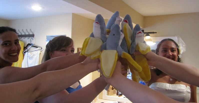 Switching gears a little bit. I thought I could also talk briefly about my bridesmaids’ gifts. I got them each a necklace/earring set and… a stuffed Shark Banana. The shark bananas were a huuuuuge hit and all five of them plus mine showed up for the wedding (without any of us discussing this idea). We took some pictures of us pre ceremony and then our photographer found out and went to town with it. “Okay… have your banana shark kiss Potassium… okay make your banana shark a mustache… OHHHHHHH I SAW THAT! You dropped your banana shark on the ground! I am going to have to call BSPS – banana shark protection services…” It was a shark banana/bridesmaid/bride extravaganza. Can’t wait to see those pictures… But until then, here is a picture of all the Shark bananas in the bridal suite before the wedding started… :)