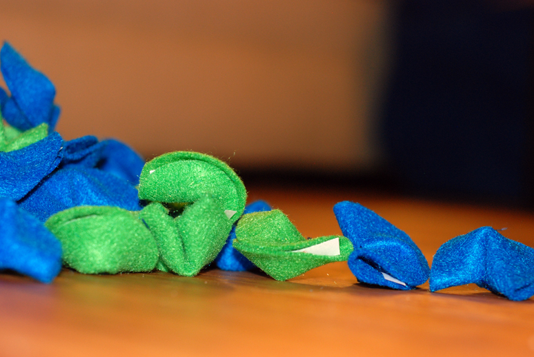 Lots of fun in this post. I hope you enjoy reading it as much as I did writing it. First, the fortunes. So in case you are just tuning in to the “Recap of Potassium and Cobalt’s Wedding” Series, let me remind you that for our wedding, we made felt fortune cookies as our favors (pattern is here). The fortune cookies were prominantly featured on the blog mostly because Cobalt and I couldn’t decide what to put on the fortunes. We actually figured out the back first (It said: “Lucky numbers: 8 4 12”) and then finally, one day while visiting Cobalt’s family, we cranked out 10 possible fortunes: facts about Cobalt and me. Nine of them are complete lies and one of them is a very silly truth. Cobalt typed them all up to make them actually look like fortunes (he picked an amazing font and they printed out really great) and then Cobalt and the T stuffed each fortune cookie with one of the fortunes before the T and I set off to CA. All this work was put in…. and then we forgot to put the fortunes out for our guests…….